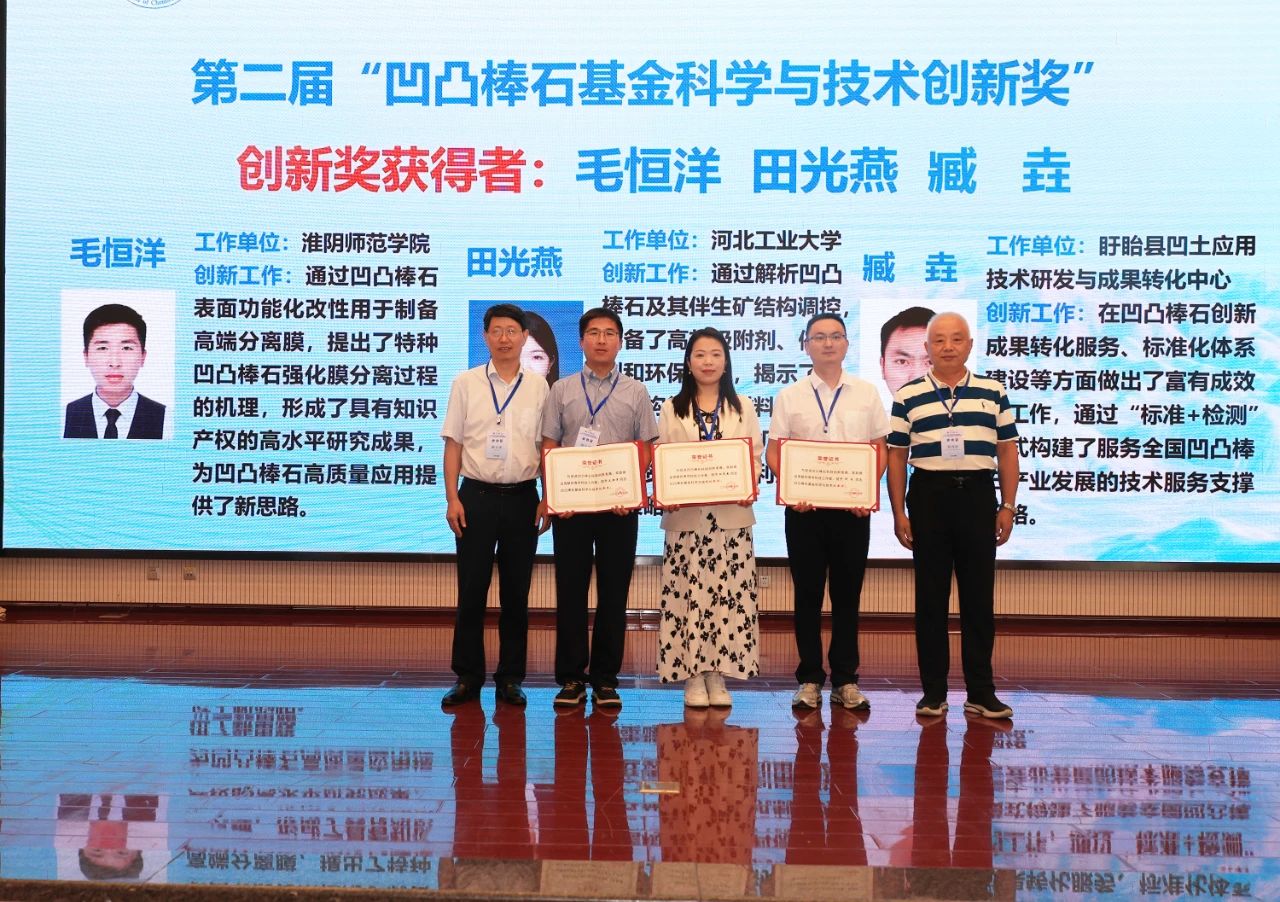 開幕式上,頒發(fā)了第二屆凹凸棒石基金科學(xué)與技術(shù)創(chuàng)新獎,以激勵更多優(yōu)秀人才加入凹凸棒石研究隊伍。蘭州化物所康玉茹高級工程師榮獲進(jìn)步獎,河北工業(yè)大學(xué)田光燕副教授、淮陰師范學(xué)院毛恒洋副教授和盱眙縣凹土應(yīng)用技術(shù)研發(fā)與成果轉(zhuǎn)化中心臧垚工程師獲得創(chuàng)新獎。