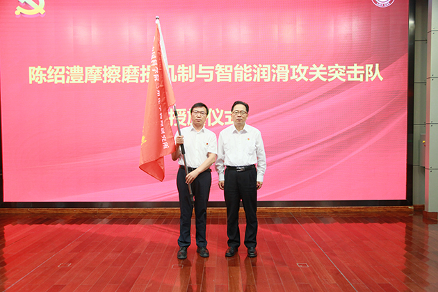 大會舉行了陳紹澧摩擦磨損機制與智能潤滑攻關突擊隊授旗儀式,王齊華向突擊隊隊長張永勝研究員授予旗幟,張永勝作了表態(tài)發(fā)言。