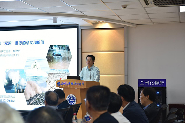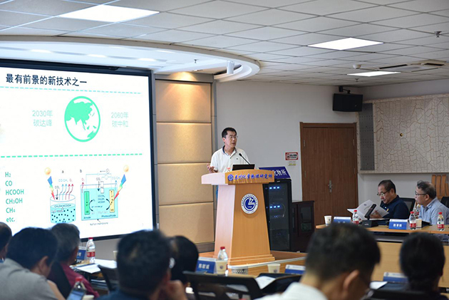 蘭州化物所副所長、黨委委員石峰作了題為“西部地區(qū)資源能源結(jié)構(gòu)與國家‘雙碳戰(zhàn)略’”的主旨報(bào)告。介紹了我國碳捕捉、利用與封存技術(shù)(CCUS)的發(fā)展與應(yīng)用,分享了二氧化碳生物利用技術(shù)的綠色生態(tài)理念,就國家“雙碳戰(zhàn)略”和西部地區(qū)資源能源結(jié)構(gòu)進(jìn)行了深入探討。他強(qiáng)調(diào),我國西部地區(qū)太陽能、風(fēng)能等清潔能源豐富,要積極響應(yīng)國家號召,著力解決石化工業(yè)供需不匹配、低碳生產(chǎn)工藝技術(shù)自主創(chuàng)新能力不足等問題。甘肅省飛天學(xué)者特聘教授、蘭州大學(xué)化學(xué)化工學(xué)院丁勇教授作了題為“分子催化劑光催化水分解以及二氧化碳還原研究”的特邀報(bào)告。重點(diǎn)介紹了光催化分解水技術(shù)和二氧化碳光催化還原在實(shí)現(xiàn)碳達(dá)峰、碳中和的研究進(jìn)展,討論了二氧化碳光催化轉(zhuǎn)化存在可見光區(qū)吸收弱、分離難轉(zhuǎn)移慢、析氫反應(yīng)等制約發(fā)展的關(guān)鍵問題,分享了其團(tuán)隊(duì)合成了多氧鎢酸鹽節(jié)點(diǎn)的金屬-有機(jī)籠等特定結(jié)構(gòu)的催化劑,并采用引入普魯士藍(lán)類似物作為助催化劑等方法更高效地實(shí)現(xiàn)了光催化的二氧化碳還原。