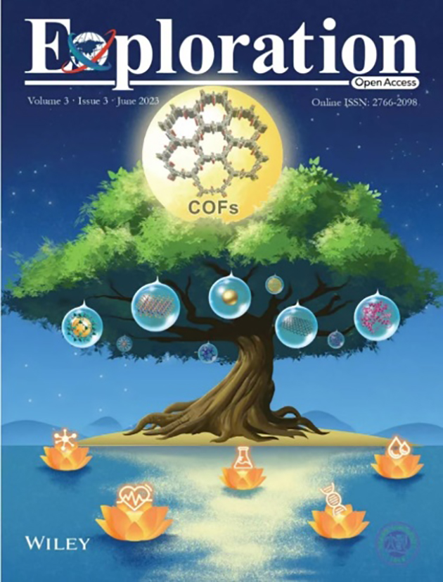 然而,COFs導(dǎo)電性弱、分散性較差、合成成本較高、難以批量生產(chǎn)等缺陷,限制了其進(jìn)一步應(yīng)用。為滿(mǎn)足應(yīng)用需求,近年來(lái)不斷涌現(xiàn)出COFs與其他功能材料的復(fù)合材料,在一定程度上可克服單一COFs或功能材料不足的問(wèn)題,表現(xiàn)出強(qiáng)于原來(lái)單一COFs或功能材料的性能。基于COFs復(fù)合材料的優(yōu)異性能,研究人員以TAPB和2,5-二乙烯基對(duì)苯二醛(DVA)為原料,在氧化石墨烯(GO)表面進(jìn)行室溫席夫堿反應(yīng),原位合成了GO/COFs復(fù)合材料,成功用于環(huán)境中芳烴類(lèi)化合物的吸附去除,其表現(xiàn)出比單一COFs或GO更優(yōu)異的吸附性能(Environmental Science: Nano, 2022, 9, 554)。研究人員以“Composite Materials based on Covalent Organic Frameworks for Multiple Advanced Applications”為題撰寫(xiě)了相關(guān)綜述(Exploration, 2023, 3, 20220144),入選Frontispiece(圖2)。