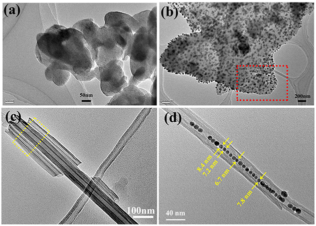 圖1 (a) Kaolin, (b) Kaolin/AgNPs雜化體, (c) HNTs, (d) HNTs /AuNPs雜化體