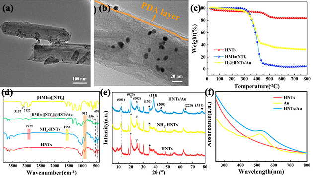 圖3 HNTs/Au@[HMIm][NTf2]微膠囊的結(jié)構(gòu)表征與成分分析