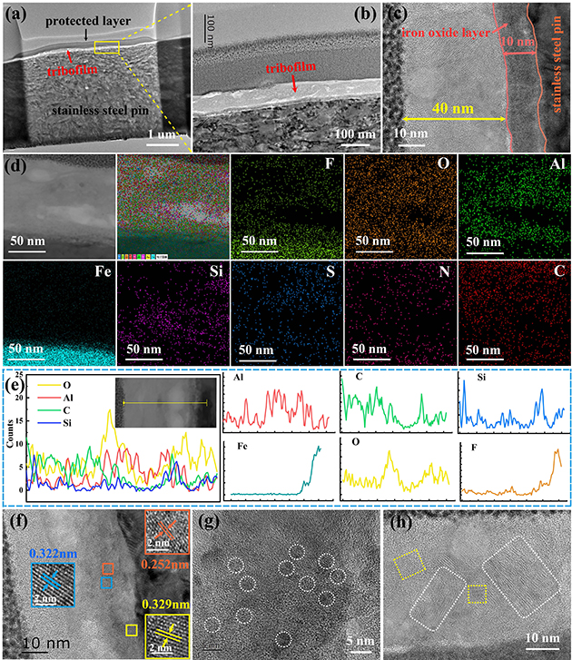 研究人員對摩擦膜進(jìn)行了深入分析,認(rèn)為微膠囊主要以鋪展-吸附和摩擦化學(xué)兩種機(jī)制發(fā)揮抗摩效應(yīng)。摩擦過程中層狀硅酸鹽進(jìn)入摩擦界面,發(fā)生解離、破碎和片層滑移,吸附或填補(bǔ)到摩擦副表面;在機(jī)械研磨和摩擦熱作用下對偶鋼表面大量Fe被活化,HNTs晶體破壞產(chǎn)生的活性基團(tuán)Si-、-Si-O-、-Mg-OH和活性Fe間接形成Si-O-Fe,Mg-O-Fe金屬陶瓷相,[HMIm][NTf2]所含活性元素F、S和活性Fe反應(yīng)形成FeF2和FeS,以及生成的鐵氧化物如Fe2O3、Fe3O4和FeO等共同存在于摩擦膜中,提高了復(fù)合材料的耐磨性。
