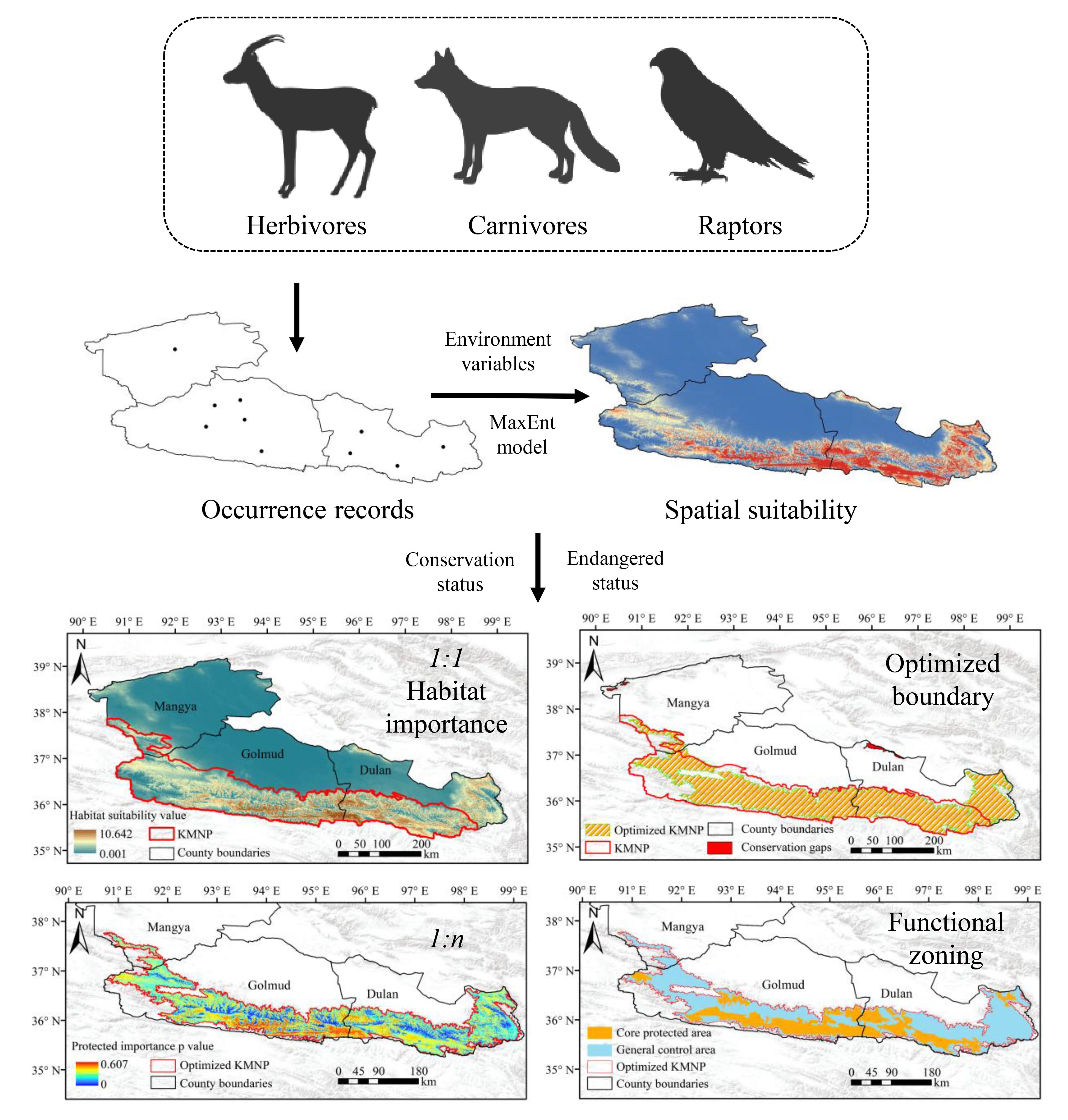 為探究昆侖山國家公園(青海片區(qū))邊界范圍及功能區(qū)域劃分,中國科學院西北高原生物研究所動物生態(tài)與資源保護研究團隊在2021年12月至翌年1月(冬季)和2022年7月(夏季)期間開展昆侖山國家公園(青海片區(qū))候選區(qū)的野生動物本底調(diào)查,記錄了16個國家級保護動物共計4523個位點(優(yōu)化后為3921個),采用生態(tài)位模型開展該區(qū)域重要物種適宜棲息地評估研究,并基于不同野生動物的保護現(xiàn)狀及瀕?,F(xiàn)狀,開展昆侖山國家公園邊界范圍及其功能區(qū)域劃分及其保護空缺研究。研究表明,昆侖山地區(qū)重點物種適宜分布于海拔4100 m至4700 m、年平均溫度為-2℃至-4.5℃之間的半干旱區(qū),其植被類型為高寒草甸和高寒草原,土地利用類型為草地和未利用土地。不同野生動物在昆侖山地區(qū)的適宜空間分布不盡相同,主要集中在昆侖山地區(qū)西南部、中部及東南部地區(qū)。優(yōu)化昆侖山國家公園青海片區(qū)的面積約為4.98×104 km2,比候選區(qū)域面積減少了16.3%,其中核心保護區(qū)和一般管控區(qū)面積分別為1.63×104 km2和3.32×104 km2。93.75%(15/16)的重點物種在昆侖國家公園核心保護區(qū)的適宜性依次高于優(yōu)化區(qū)域、候選區(qū)域及茫崖市-格爾木市-都蘭縣地區(qū),這表明昆侖山國家公園邊界范圍劃分及功能區(qū)域劃分具有較強的合理性。該研究成果不僅為昆侖山國家公園的保護和管理提供了重要科學依據(jù),有助于維護生態(tài)系統(tǒng)、保護生物多樣性和促進重點物種的繁衍生存,而且為青藏高原國家公園群的建設(shè)和生態(tài)文明提供了指導,具有潛在的應用前景。