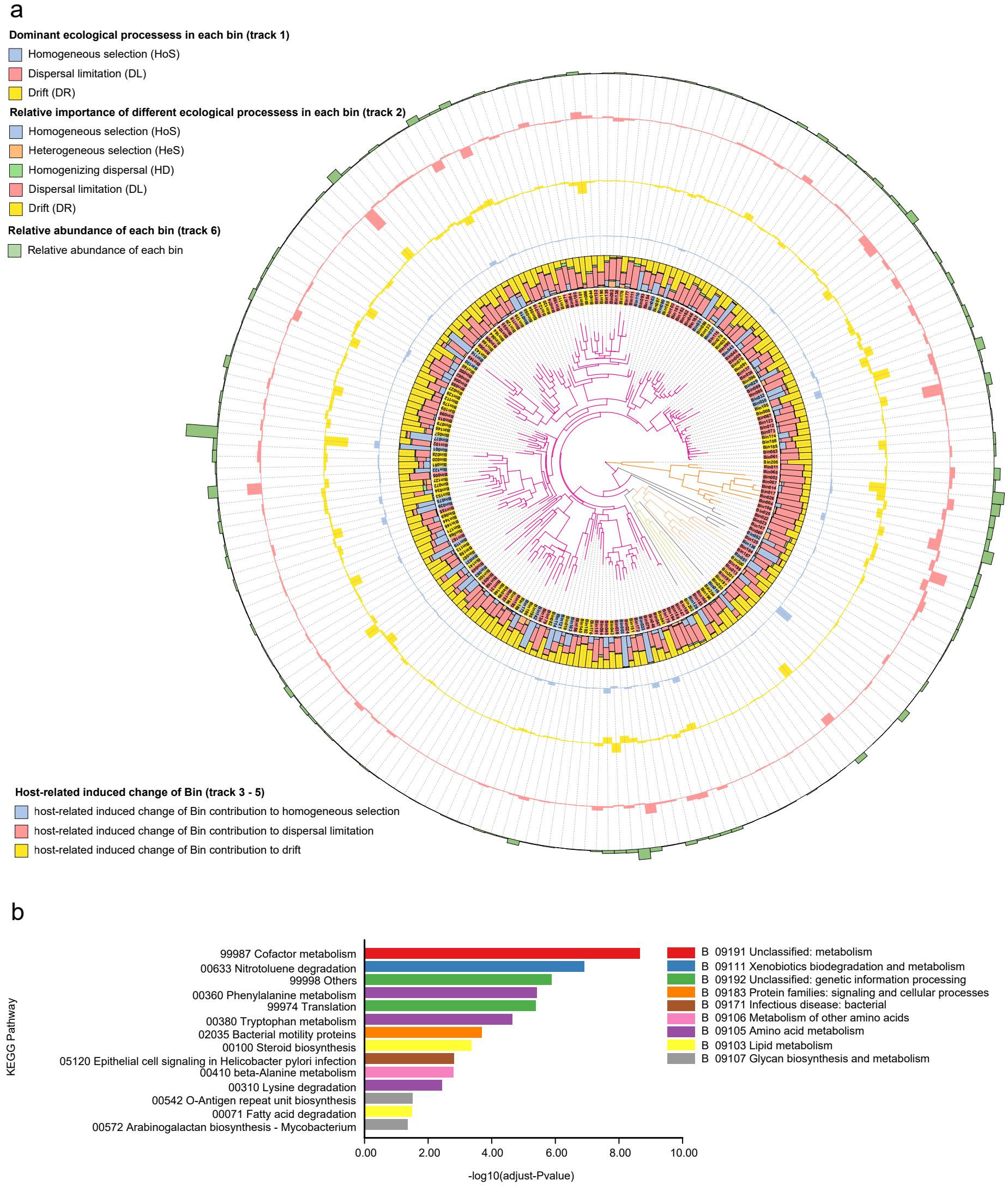 藏原羚和普氏原羚腸道微生物不同系統(tǒng)發(fā)育分箱的生態(tài)學(xué)組裝過(guò)程(a)及在普氏原羚腸道微生物中貢獻(xiàn)了同質(zhì)選擇過(guò)程而在藏原羚中卻貢獻(xiàn)了其他生態(tài)學(xué)組裝過(guò)程的ASVs集合所進(jìn)行的KEGG富集分析(b)