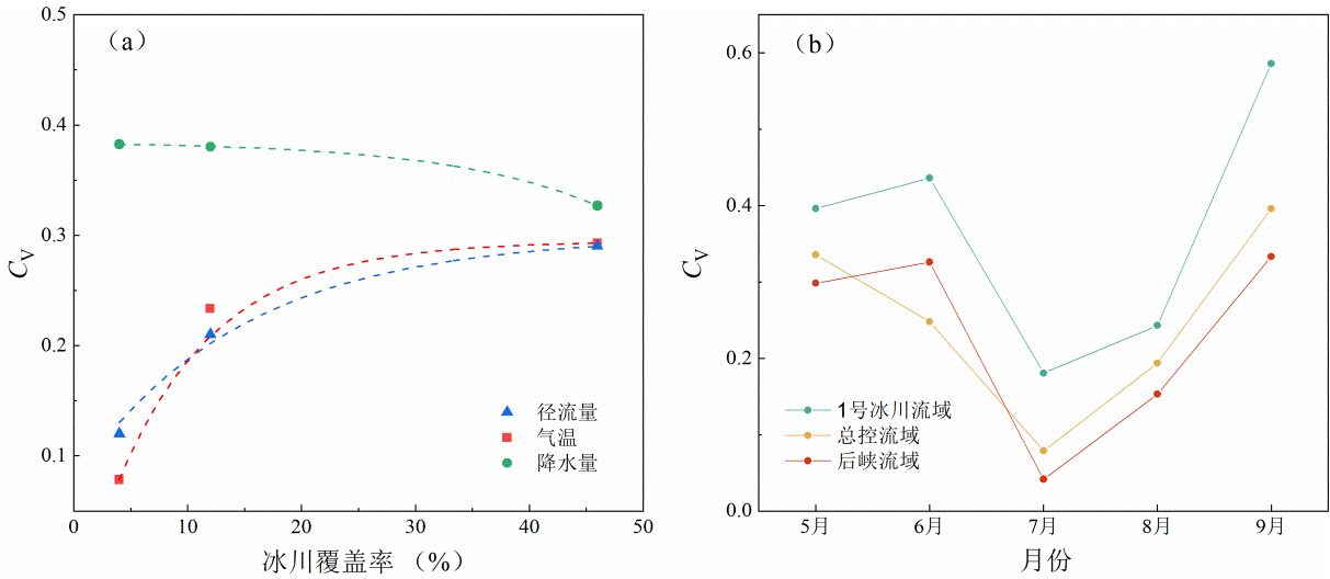 (3)三個子流域融冰徑流和冰川徑流的貢獻(xiàn)率與冰川覆蓋率呈線性關(guān)系,與前人在阿爾卑斯山38個冰川覆蓋流域研究得到的對數(shù)關(guān)系有所不同,主要是烏河流域冰川在夏季強(qiáng)烈消融所致(圖3)。三個子流域的徑流變差系數(shù)(CV)分別為0.29、0.21和0.12,隨著冰川覆蓋率的降低而減小,這主要與流域徑流組成、下墊面特征等因素有關(guān)(圖4)。