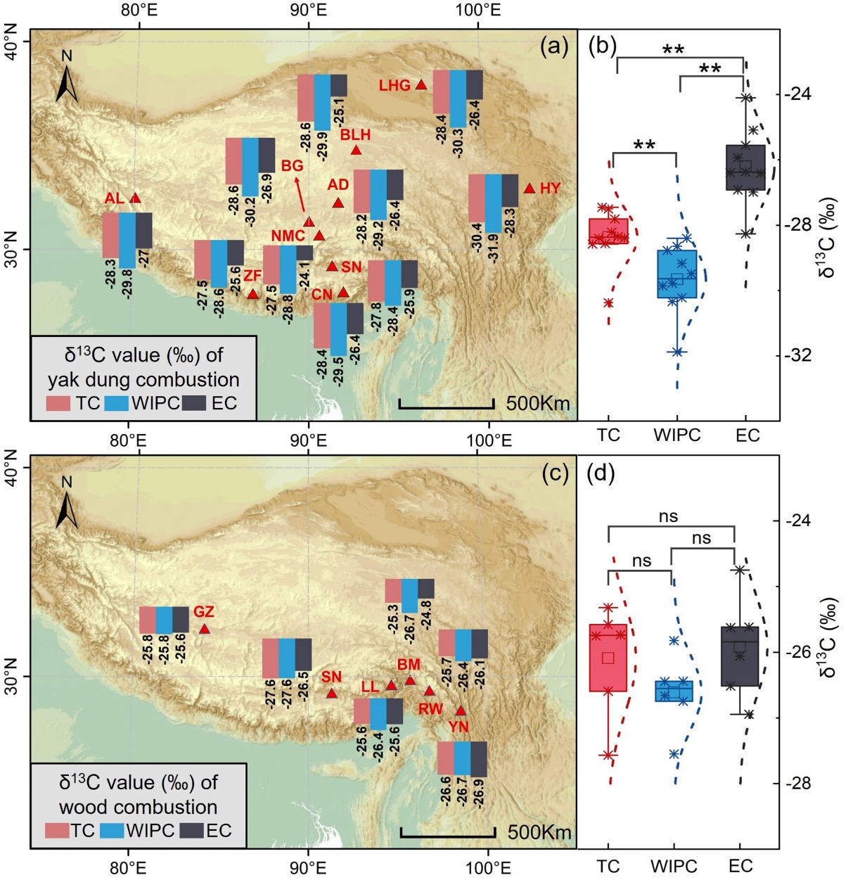 圖2. 青藏高原生物質(zhì)燃料源的不同碳質(zhì)組分δ13C值分布