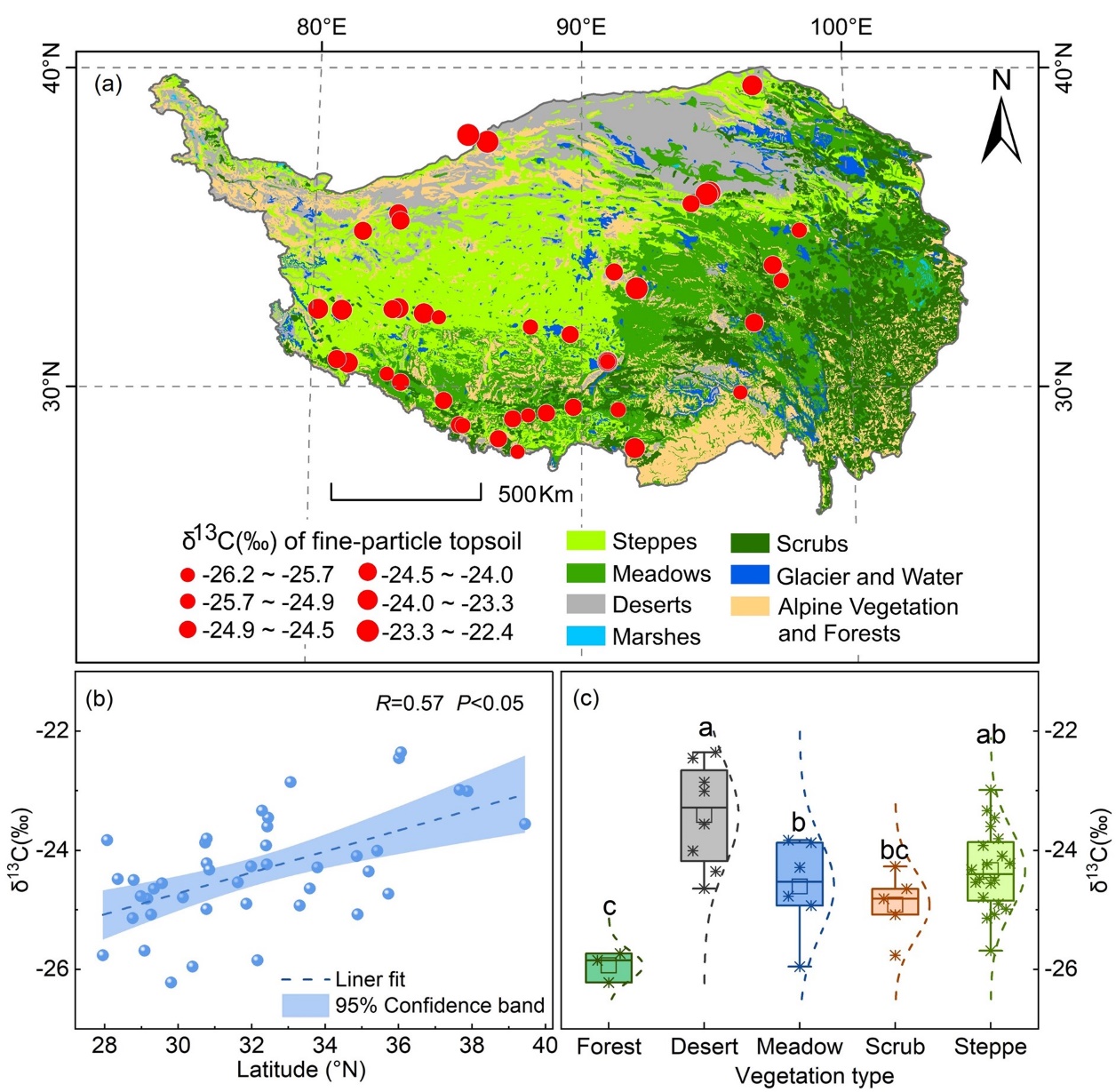 圖3. 青藏高原細顆粒表土δ13C值的空間分布