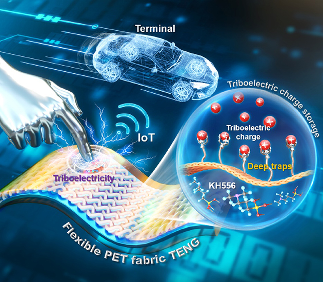 摩擦起電過程中產(chǎn)生的電荷會瞬時存儲在電介質(zhì)表面,進而被兩種不同類型的陷阱(淺陷阱和深陷阱)捕獲。其中,淺陷阱中的電荷容易逸出,優(yōu)先耗散到環(huán)境中,而深陷阱中的電荷則因為極難逸出,可長期儲存。因此,影響摩擦層電荷耗散率的關鍵因素是陷阱捕獲電荷和被捕獲電荷的逃逸能力?;诖?,該團隊通過系統(tǒng)研究,揭示了載流子深陷阱在摩擦電荷存儲中的機制,通過分子自組裝技術在織物摩擦層界面構建載流子深陷阱的方式增加TENG的電輸出,將該織物TENG用于物聯(lián)網(wǎng)可穿戴電子設備的電源模塊,實現(xiàn)了對機械運動的穩(wěn)定控制。相關研究成果發(fā)表在Advanced Materials(2024,2303389)上。