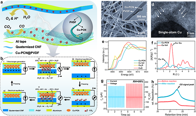 近日,研究團隊與新加坡科學技術研究局的科研人員合作,在界面電荷利用方面做出新突破,利用單原子銅錨定的聚合物碳氮化物催化劑和季銨化纖維素納米纖維成功實現(xiàn)了接觸電催化CO2還原,生成CO的法拉第效率達到96.24 %。季銨化纖維素納米纖維由于含豐富的羥基,可在高濕度環(huán)境中與水分子形成氫鍵,固定水分子并參與接觸帶電并發(fā)生氧化反應,導致氧氣和質(zhì)子的產(chǎn)生,參與觸電催化CO2還原過程。這種方法在低濃度CO2環(huán)境中能高效地將其轉(zhuǎn)化為CO,為減少大氣CO2排放和推進化學可持續(xù)性策略提供了一種解決方案。