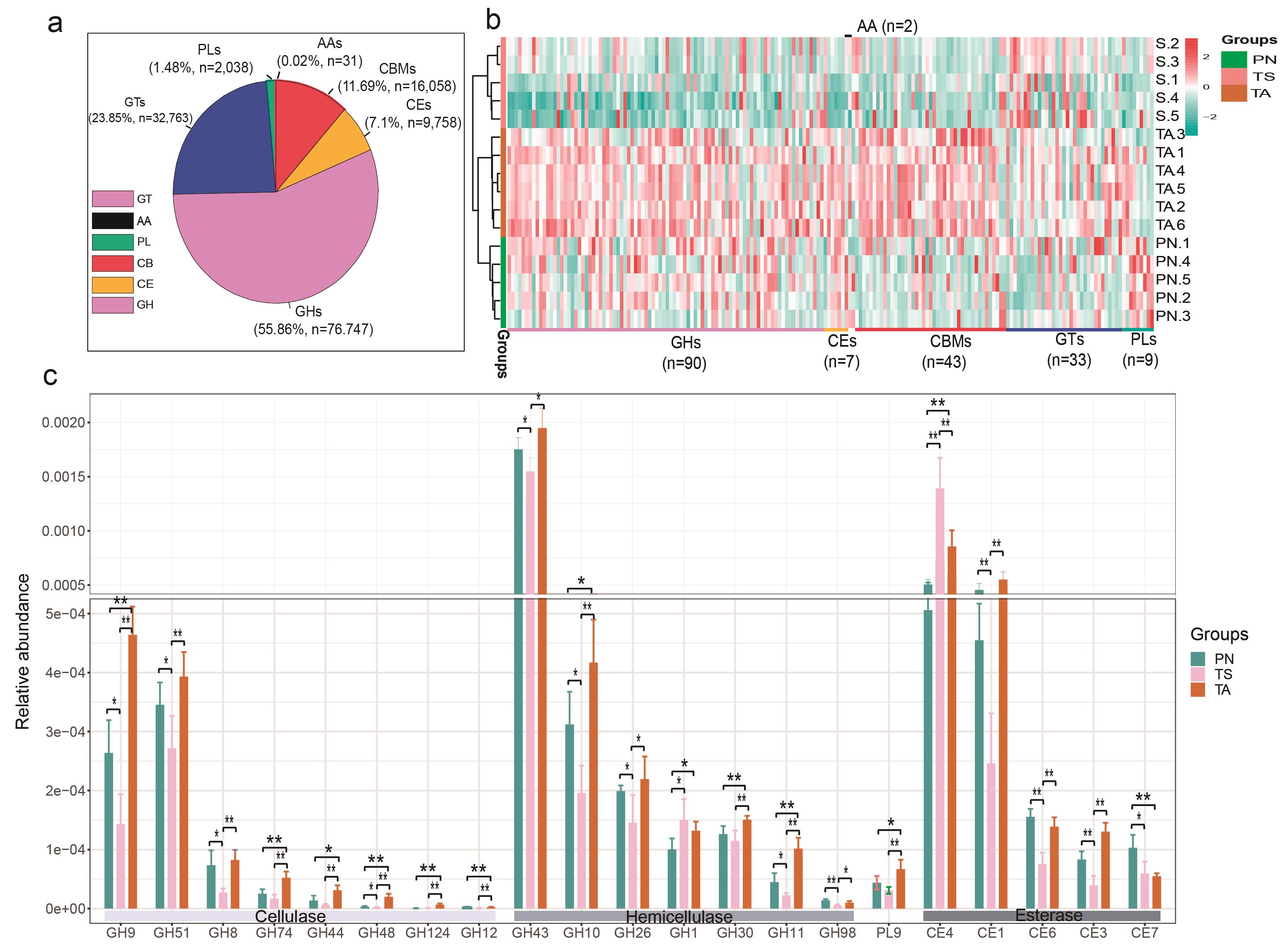 不同小反芻動物CAZYme酶基因分布特征。(a) unigenens 整體分布狀況;(b)糖苷水解酶(GHs)、糖基轉(zhuǎn)移酶(GTs)、多糖裂解酶(PLs)、碳水化合物酯酶(CEs)及碳水化合物結(jié)合模塊(CBMs)富集分析;(c)不同小反芻動物腸道菌群有關(guān)纖維素酶、半纖維素酶及酯酶基因顯著性分析