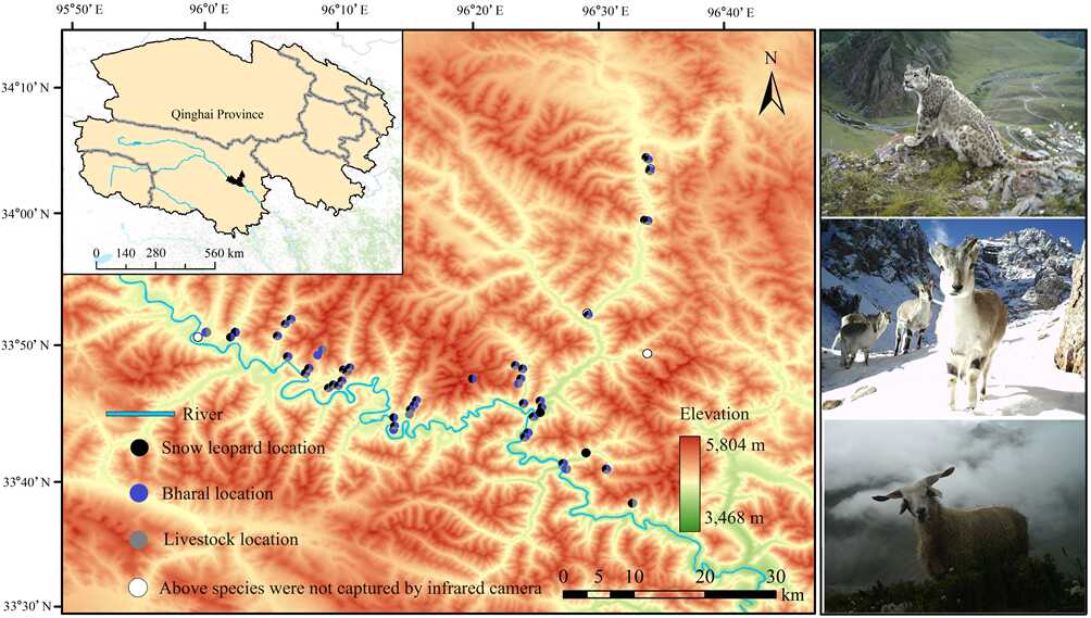 中國(guó)科學(xué)院西北高原生物研究所動(dòng)物生態(tài)與資源保護(hù)研究團(tuán)隊(duì)以人獸沖突較為嚴(yán)重的曲麻萊縣巴干鄉(xiāng)為研究地區(qū),利用調(diào)查問卷評(píng)估了當(dāng)?shù)啬撩駥?duì)雪豹襲擊家畜事件的態(tài)度,并結(jié)合紅外相機(jī)陷阱技術(shù)獲得了雪豹和其主要獵物巖羊(Pseudois nayaur)以及散養(yǎng)家畜的影像資料,進(jìn)而探討了三種(類)動(dòng)物的時(shí)空重疊。研究結(jié)果表明:?。?)雪豹主要在夜間捕食家畜,牧民因雪豹襲擊家畜事件的發(fā)生而對(duì)雪豹保護(hù)持消極態(tài)度;(2)巖羊和家畜的空間利用重疊度最高(OI = 0.78),其次是雪豹和巖羊(OI?。健?.75)以及雪豹和家畜(OI?。健?.75);(3)雪豹屬于典型的夜行性動(dòng)物,而巖羊和家畜以晝間活動(dòng)為主。巖羊和家畜的日活動(dòng)節(jié)律模式高度一致,時(shí)間重疊指數(shù)最高(D = 0.95),而雪豹和巖羊、雪豹和家畜的日活動(dòng)節(jié)律重疊指數(shù)較低(D?。健?.51),且重疊時(shí)段主要集中于夜間。綜上所述,由于雪豹、巖羊和散養(yǎng)家畜之間存在較高的空間重疊,可能增加了家畜被雪豹捕食的機(jī)會(huì),同時(shí),家畜和巖羊活動(dòng)節(jié)律的高度重疊進(jìn)一步加劇了此類事件的發(fā)生幾率?;谘芯拷Y(jié)果,我們提出了針對(duì)性的保護(hù)和管理措施,例如規(guī)范放牧區(qū)域以減小家畜與雪豹的相遇幾率,加強(qiáng)對(duì)散養(yǎng)家畜的夜間管理以減少雪豹夜間肇事等。