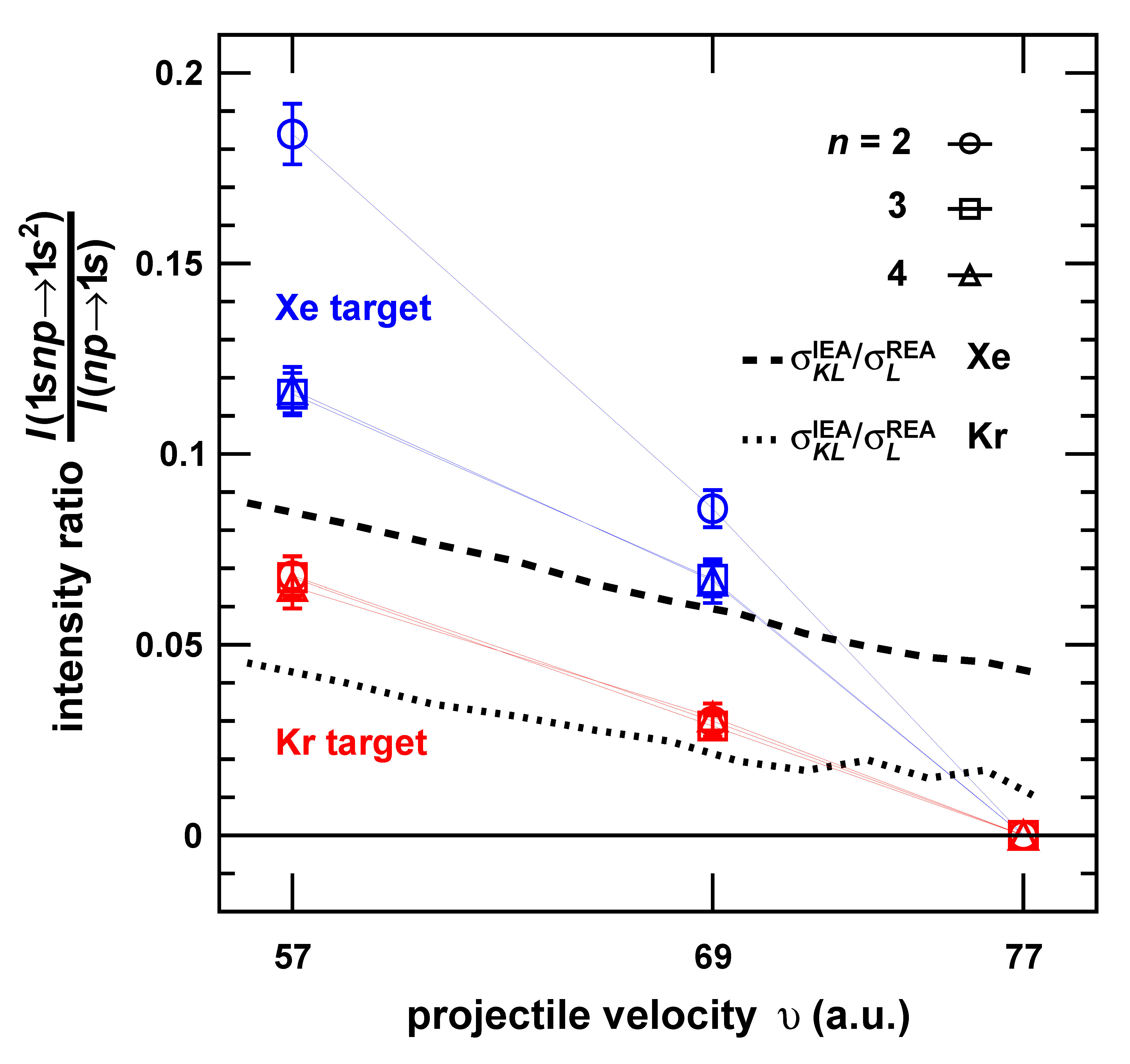 近代物理所原子分子譜學研究團隊利用蘭州重離子加速器冷卻儲存環(huán)(HIRFL-CSR),開展了百MeV/u能區(qū)Xe54++Xe對稱碰撞實驗研究。在“能級匹配”和“速度匹配”條件同時滿足時,團隊發(fā)現(xiàn)共振電子俘獲在非輻射雙電子俘獲(NRDC)過程中起重要作用,引起關聯(lián)俘獲,此時獨立電子近似不再成立。與之相反,Xe54++Kr碰撞中的NRDC過程是兩個獨立的單俘獲。