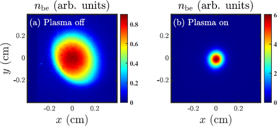 實驗中,基于高能電子成像實驗平臺,科研人員利用熱陰極微波電子槍產(chǎn)生的電子束及高壓直流放電等離子體靶,成功觀察到電子束在有源等離子體透鏡中的聚焦現(xiàn)象,同時對其聚焦原理深入分析。實驗結(jié)果表明(圖1):當?shù)入x子體靶不放電時,YAG屏上的束斑為1.25 mm,而該靶調(diào)節(jié)至合適的放電電壓和氣壓后,束斑減小至0.48mm,聚焦效果顯著!