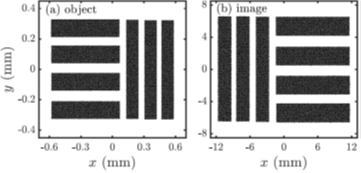 鑒于有源等離子體透鏡具有緊湊、聚焦梯度大、對稱聚焦、色差小的優(yōu)勢,科研人員將該透鏡成功應(yīng)用到高能電子成像中。從高能電子束在透鏡中的傳輸矩陣出發(fā),科研人員設(shè)計了一個總長為44.87cm、放大倍數(shù)為20的高能電子成像系統(tǒng),其點對點成像模擬結(jié)果如圖2所示。模擬結(jié)果表明:該系統(tǒng)的成像分辨率可以達到亞微米量級,相較于基于電磁四極鐵的全長為5m(放大倍數(shù)為10)的成像系統(tǒng)十分緊湊。