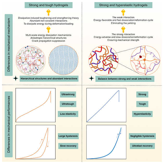 圖1. 強韌水凝膠和超彈性水凝膠在力學(xué)機制和性能方面的差異