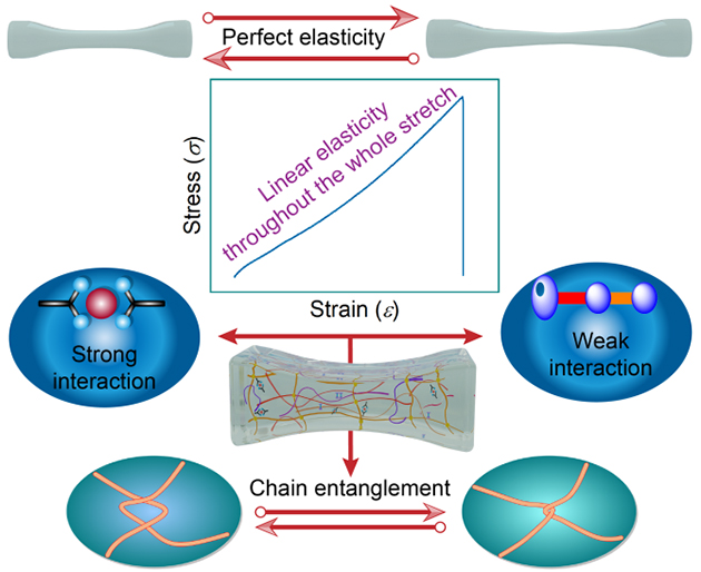近日,中國科學(xué)院蘭州化學(xué)物理研究所提出了耗散能分子工程策略,該策略指強弱相互作用在分子水平上的互補性,即強相互作用(金屬配位鍵)提供力學(xué)強度,弱相互作用(氫鍵)消除屈服;進(jìn)一步在網(wǎng)絡(luò)中植入密集的鏈纏結(jié),從而實現(xiàn)完美的超彈性,填補了僅使用高階結(jié)構(gòu)(納米相分離、珍珠項鏈結(jié)構(gòu)和彈性蛋白)來設(shè)計超彈性水凝膠的空白。此外,這兩種相互作用在鍵合時間和鍵合能之間的互補性提供了具有可控范圍的力學(xué)性能調(diào)控窗口。