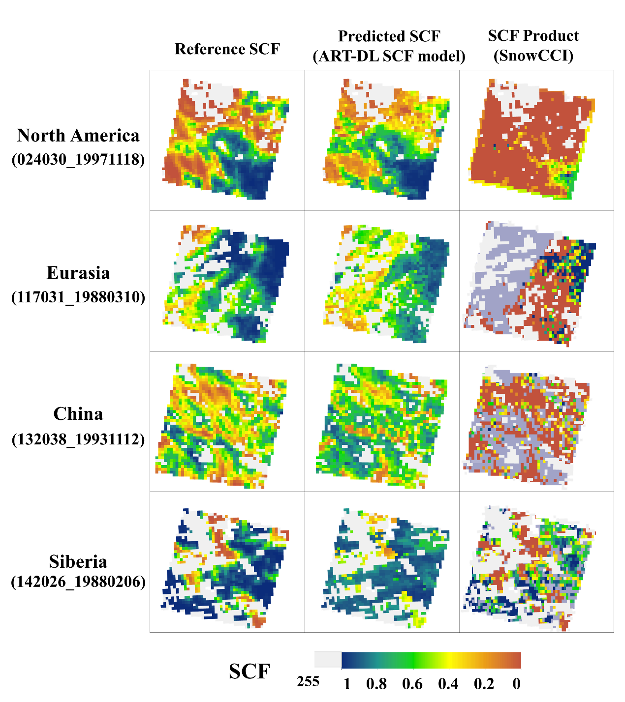 通過結(jié)合積雪輻射傳輸模型(ART),AVHRR表面反射率數(shù)據(jù)反演北半球SCF。新模型使用 Landsat 5積雪圖像作為參考SCF,將ART模型反演的積雪反照率作為物理約束納入相關(guān)的積雪識(shí)別參數(shù)中。