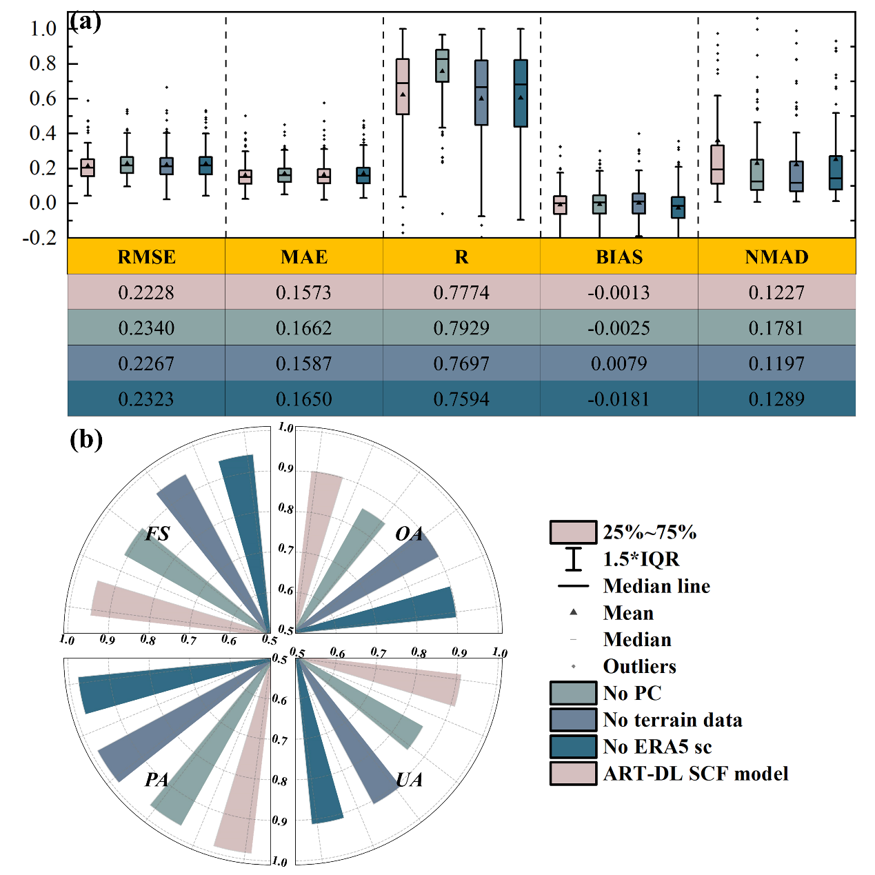 與Landsat參考SCF的綜合驗(yàn)證結(jié)果顯示,整體準(zhǔn)確率為90.20%,錯(cuò)分誤差和漏分誤差均在10%以下。值得注意的是,引入物理約束既提高了模型的準(zhǔn)確性和穩(wěn)定性,又減輕了低估問題。與沒有物理約束的模型相比,ART-DL SCF模型的均方根誤差顯著降低了4.79個(gè)百分點(diǎn),平均絕對(duì)誤差降低了5.35個(gè)百分點(diǎn)。這些準(zhǔn)確度明顯高于歐洲空間局?。‥SA) 目前可用的 SnowCCI AVHRR產(chǎn)品。