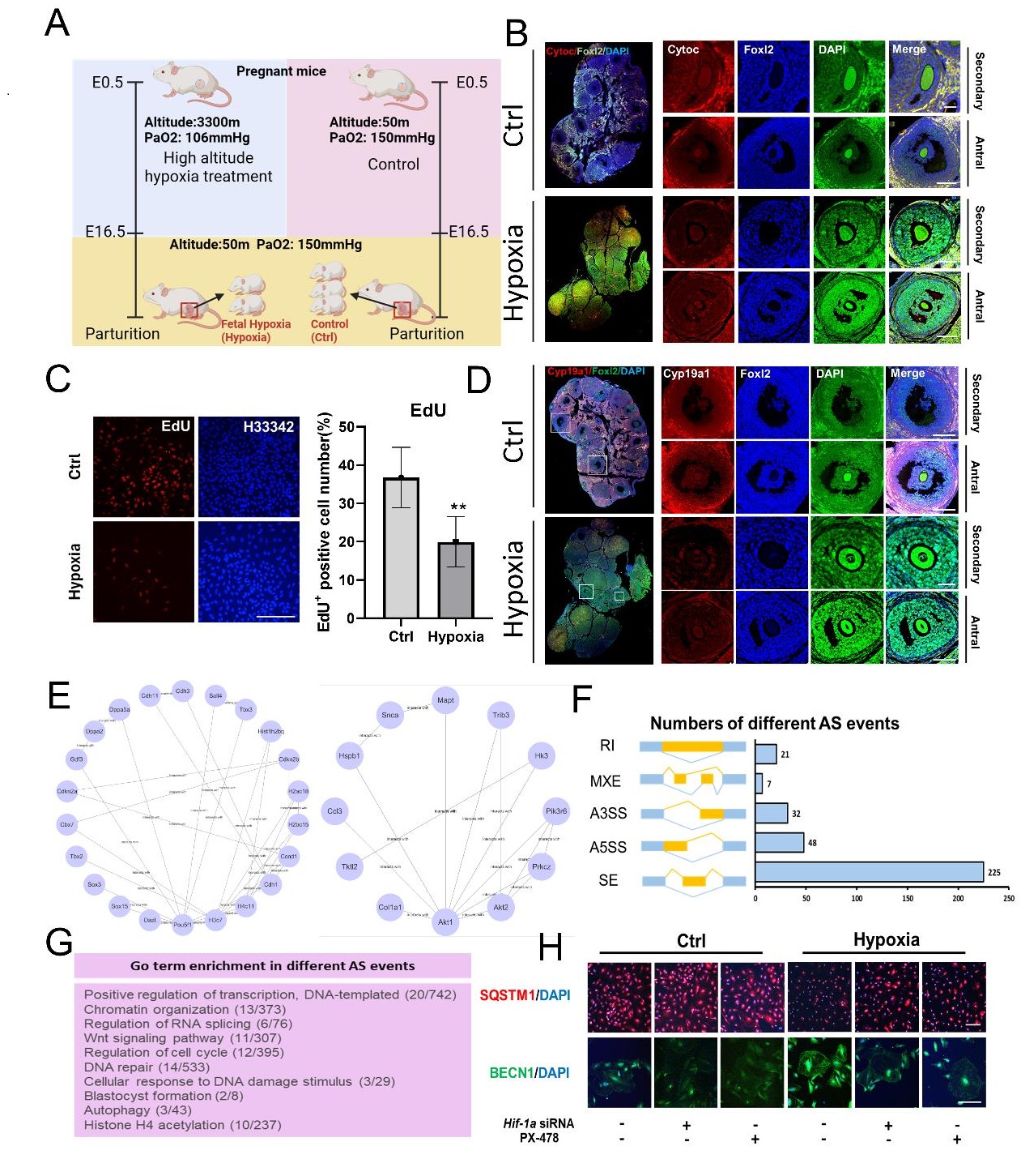 文章代表圖:A:胚胎期低氧模型建立示意圖;B:細(xì)胞色素C免疫熒光染色;C:體外細(xì)胞培養(yǎng)EdU細(xì)胞增殖活性檢測(cè);D:雌激素合成轉(zhuǎn)化關(guān)鍵酶Cyp19a1免疫熒光染色;E:轉(zhuǎn)錄因子PPI富集分析圖;F:不同類型可變剪切差異統(tǒng)計(jì);G:不同可變剪切事件發(fā)生基因的Go富集分析;H:體外實(shí)驗(yàn)通過轉(zhuǎn)染Hif-1a SiRNA 和抑制劑添加檢測(cè)自噬相關(guān)蛋白表達(dá)水平