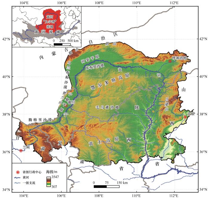 黃河“幾字彎”是荒漠化綜合防治和“三北”工程建設三大標志性戰(zhàn)役的發(fā)起地之一,也是黃河流域生態(tài)保護和高質(zhì)量發(fā)展的重點區(qū)域。黃河“幾字彎”因黃河繞行此區(qū)域的形狀似彎曲環(huán)抱的“幾”字而得名,泛指黃河流經(jīng)的甘肅、寧夏、內(nèi)蒙古、陜西、山西五省份的行政都市圈(圖1)。