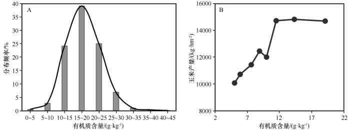 圖1? 河西走廊土壤有機質(zhì)含量及相同灌溉條件下玉米產(chǎn)量