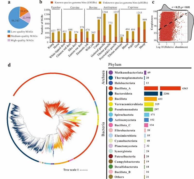 中國科學院西北高原生物研究所動物生態(tài)與資源保護研究團隊以中國境內奇蹄目(Perissodactyla)和鯨偶蹄目(Cetartiodactyla)17個常見有蹄類物種為研究對象,通過大規(guī)模宏基因組測序和組裝、分箱和注釋,獲得131,416個宏基因組組裝基因組(MAGs),其中包含22,998個高質量MAGs和11,175個菌種水平基因組(SGBs),成功構建了中國典型有蹄類物種的腸道微生物宏基因組圖譜,其中60%左右的SGBs為本研究首次報道。