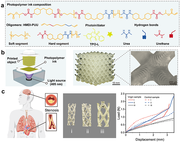 研究人員通過在聚氨酯前驅(qū)體中引入了脲基和酯基,發(fā)展了多重氫鍵誘導(dǎo)的可快速光固化3D打印的超分子聚氨酯彈性體,獲得的彈性體具有優(yōu)異的高彈性、高強(qiáng)度、韌性以及良好的生物相容性和血液相容性。具有高精度光固化3D打印性能的聚氨酯彈性體綜合了高性能與快速結(jié)構(gòu)制造方面的優(yōu)勢,為具有優(yōu)異抗壓縮承載能力和機(jī)械穩(wěn)定性等特性的復(fù)雜柔性結(jié)構(gòu)生物醫(yī)療器械的制造提供了新的材料技術(shù)方案。