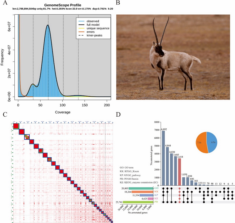 中國科學院西北高原生物研究所動物生態(tài)與資源保護研究團隊聯(lián)合青海大學,基于PacBio HiFi三代基因組測序、Hi-C測序和DNBSEQ-T7二代基因組survey測序三種測序技術,成功組裝了藏羚染色體級別的基因組。結果顯示,藏羚基因組大小為3.1 Gb,Contig N50為84.6 Mb,所有基因掛載到30條染色體上(29 + X),與之前的核型研究一致。數(shù)據(jù)評估顯示,藏羚基因組BUSCO得分為98.2%(S:92.3%,D:5.9%,F(xiàn):0.8%,M:1.0%),平均QV值為70.14,表明組裝的連續(xù)性好,完整度和準確性高?;贓DTA和RepeatModeler從頭預測的藏羚基因組中重復序列注釋結果表明,藏羚基因組重復序列主要由SINEs、LINEs、LTRs 和DNA transposons四種類型組成,序列總長度為1.65 Gb,占基因組的52.47%;基于蛋白同源預測、蛋白從頭預測和深度學習等多種策略,在藏羚基因組上共注釋到28,330個功能基因。綜上,通過多種技術手段,首次獲得了藏羚染色體水平的高質量基因組和注釋信息,為藏羚的適應進化遺傳機制、保護遺傳學研究及進一步探索物種遷徙行為的遺傳機制提供了重要的基因組資源。