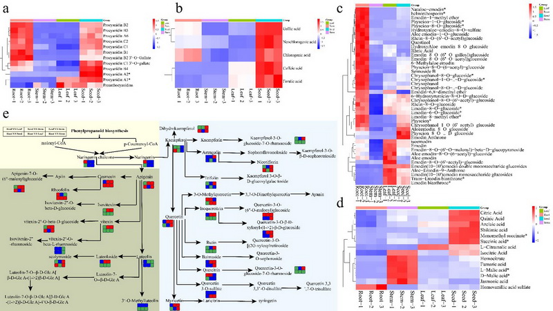 不同組織部分原花青素(a)、酚酸(b)、蒽醌(c)和有機(jī)酸(d)相對(duì)含量的熱圖及不同組織中黃酮醇生物合成途徑的一些關(guān)鍵代謝物的變化(e)