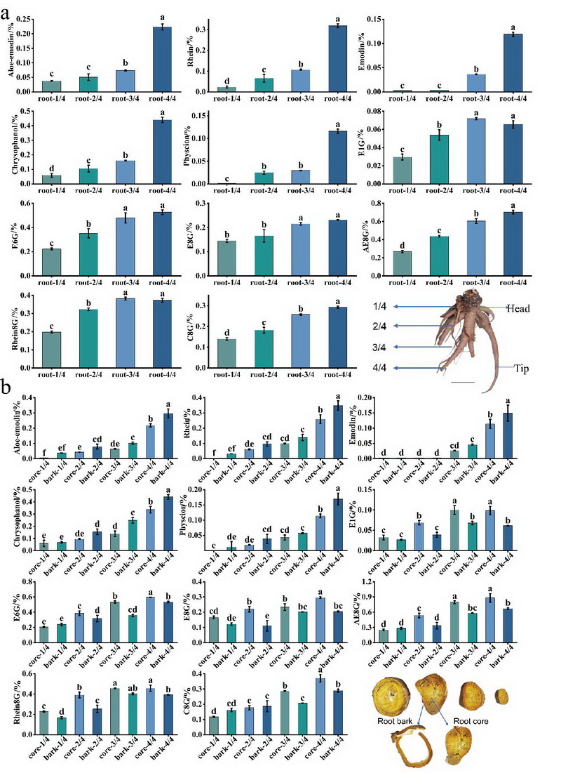 根不同部位從根頭(1/4)至根尖(4/4)的11種蒽醌類化合物含量比較(a),以及同一部位根皮和根芯中11種蒽醌類化合物含量的比較(b)