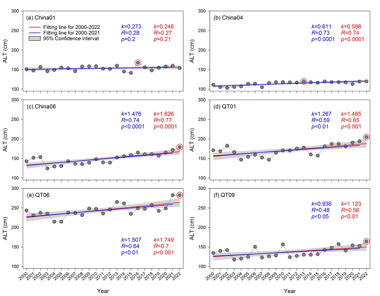 2022年夏季,青藏公路沿線6個(gè)活動(dòng)層土壤溫度和3個(gè)多年凍土鉆孔地溫均高于歷史觀測(cè)記錄。China06、QT01、QT06和QT09四個(gè)活動(dòng)層監(jiān)測(cè)點(diǎn)在2022年的活動(dòng)層厚度均達(dá)到觀測(cè)時(shí)段內(nèi)的最大值(平均值:207.7cm),比2000-2021年的平均活動(dòng)層厚度(平均值:175.9cm)高出20%。