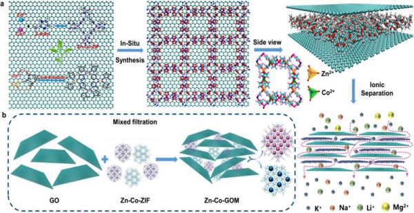 從鹽湖鹵水中獲取鋰資源是最重要的途徑之一。鹵水成分復(fù)雜,Mg2+和Li+水合離子半徑相似,鎂鋰分離難度大。膜分離技術(shù)具有節(jié)能、高效、環(huán)保、操作靈活和成本低等特點(diǎn),可通過(guò)精細(xì)調(diào)控膜的孔徑和表面化學(xué)性質(zhì),實(shí)現(xiàn)對(duì)特定離子的選擇性分離。但膜的穩(wěn)定性、耐腐蝕性以及長(zhǎng)期使用后的性能衰退仍然是制約膜分離技術(shù)應(yīng)用的主要問(wèn)題。針對(duì)上述問(wèn)題,青海鹽湖所鹽湖有機(jī)質(zhì)與硼鉀分離技術(shù)課題組開(kāi)發(fā)了一種新型的雙金屬有機(jī)框架(MOF)/氧化石墨烯(GO)復(fù)合膜,以提高鹽湖鋰的提取效率。