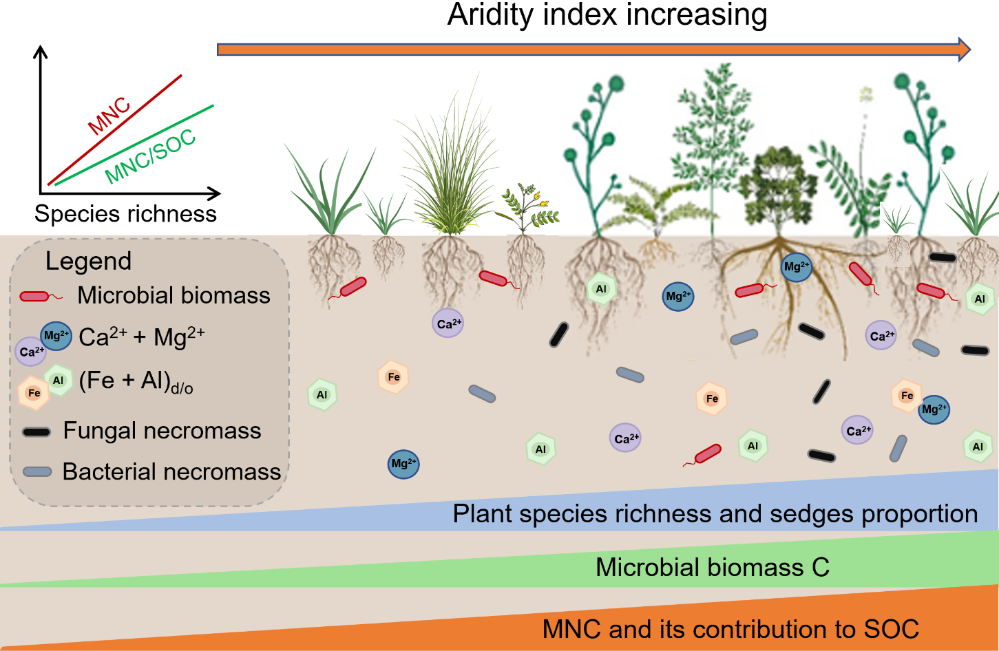 研究表明,隨著干旱指數(shù)的增加(濕度增加),植物種多樣性、植物生物量以及莎草科(Cyperaceae)在地上生物量中的比例顯著增加。同時,MNC含量及其對SOC的貢獻(xiàn)也隨干旱指數(shù)的增加而增加。結(jié)構(gòu)方程模型及偏相關(guān)分析表明,植物種多樣性在促進(jìn)土壤MNC積累和SOC固存中起關(guān)鍵作用,植物多樣性的提升顯著增加了莎草科植物的豐度,增加了根系生物量和根際沉積,進(jìn)而促進(jìn)了MNC的積累。