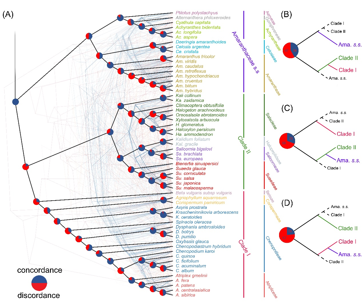 中國科學(xué)院西北高原生物研究所青藏高原植物適應(yīng)與進(jìn)化研究團(tuán)隊(duì)綜合利用質(zhì)體基因組和全長(zhǎng)ITS序列,重建了廣義莧科的系統(tǒng)發(fā)育關(guān)系。通過質(zhì)體基因組結(jié)構(gòu)和序列比對(duì)分析,發(fā)現(xiàn)濱藜屬(Atriplex)和藜屬(Chenopodium)存在一段長(zhǎng)約5200 bp的反向互補(bǔ)區(qū)域。適應(yīng)性進(jìn)化分析揭示了8個(gè)基因受到顯著的正選擇作用,這些基因可能在廣義莧科的進(jìn)化中起到了驅(qū)動(dòng)作用。系統(tǒng)發(fā)育結(jié)果表明,傳統(tǒng)藜科為單系類群,建議恢復(fù)其至科級(jí)分類學(xué)水平。對(duì)于廣義莧科的科級(jí)以下分類群,例如藜屬、鹽生草屬(Halogeton)以及豬毛菜亞族(Subtr. Salsolinae)為并系類群,建議通過建立更多的分類群或?qū)⑥甲澹–henopodieae)和濱藜族(Atripliceae)合并來解決分類問題。核質(zhì)沖突及不完全譜系分選是導(dǎo)致廣義莧科基因樹系統(tǒng)發(fā)育不一致的主要原因。本研究為廣義莧科的系統(tǒng)發(fā)育關(guān)系提供了新的見解,并指出后續(xù)仍需采取多種數(shù)據(jù)集完善廣義莧科的分類修訂。