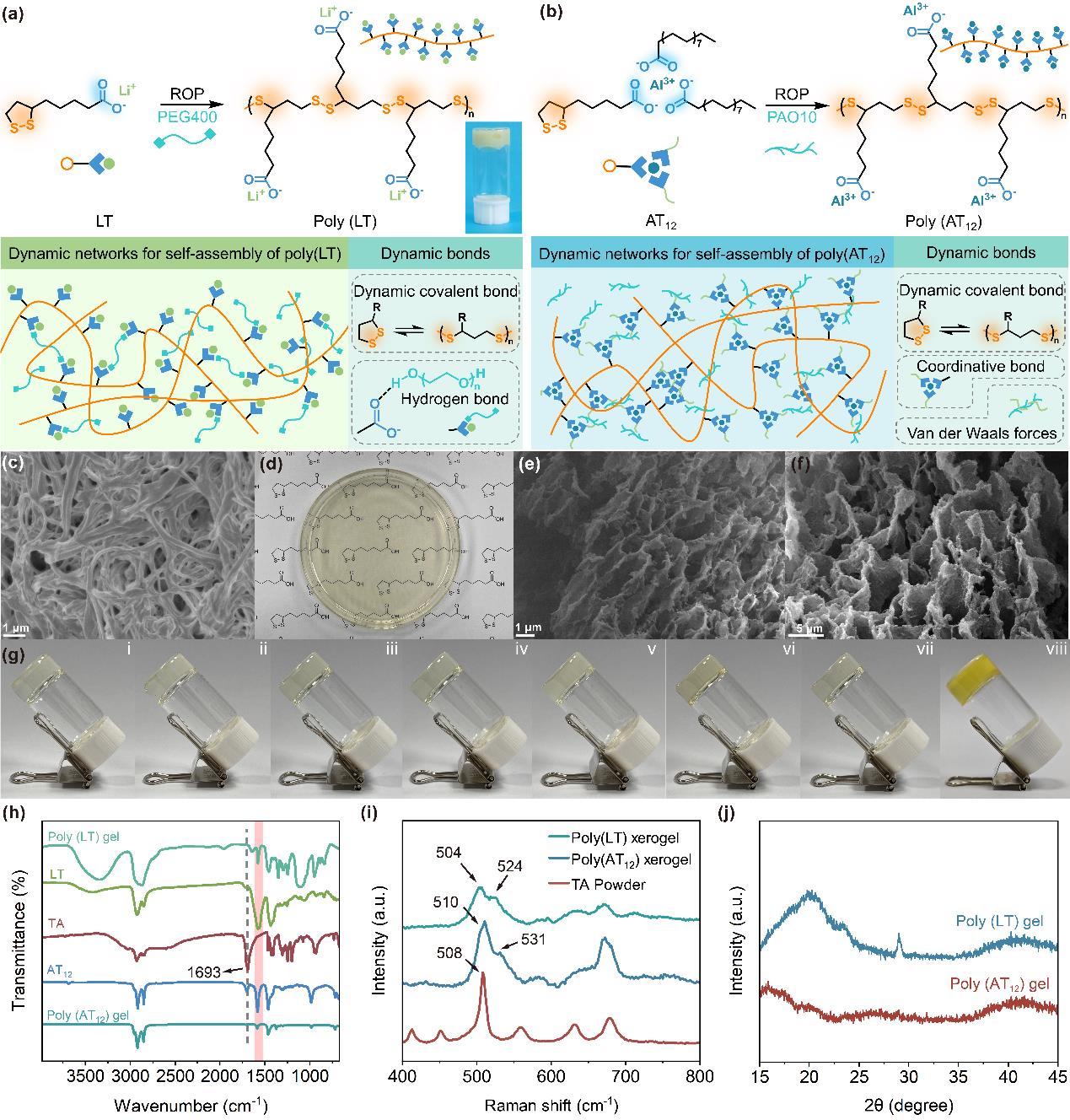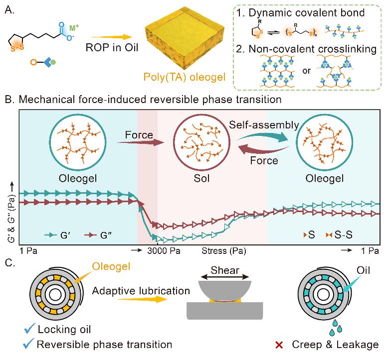 針對傳統(tǒng)潤滑油脂在新型高端裝備應(yīng)用中面臨爬移、泄漏、粘滯阻力高等難以應(yīng)對復(fù)雜多變工況的問題。近日,中國科學(xué)院蘭州化學(xué)物理研究所潤滑材料全國重點實驗室材料表面與界面研究組通過構(gòu)筑具有機械力響應(yīng)特性的動態(tài)共價網(wǎng)絡(luò),開發(fā)了一類具有力誘導(dǎo)可逆相轉(zhuǎn)變能力的自適應(yīng)油凝膠潤滑材料(PTA油凝膠)。PTA油凝膠可適應(yīng)設(shè)備啟停,在溶膠或凝膠狀態(tài)保持和迅速轉(zhuǎn)換,且具有出色的潤滑穩(wěn)定性、適應(yīng)不斷變化的運動工況。