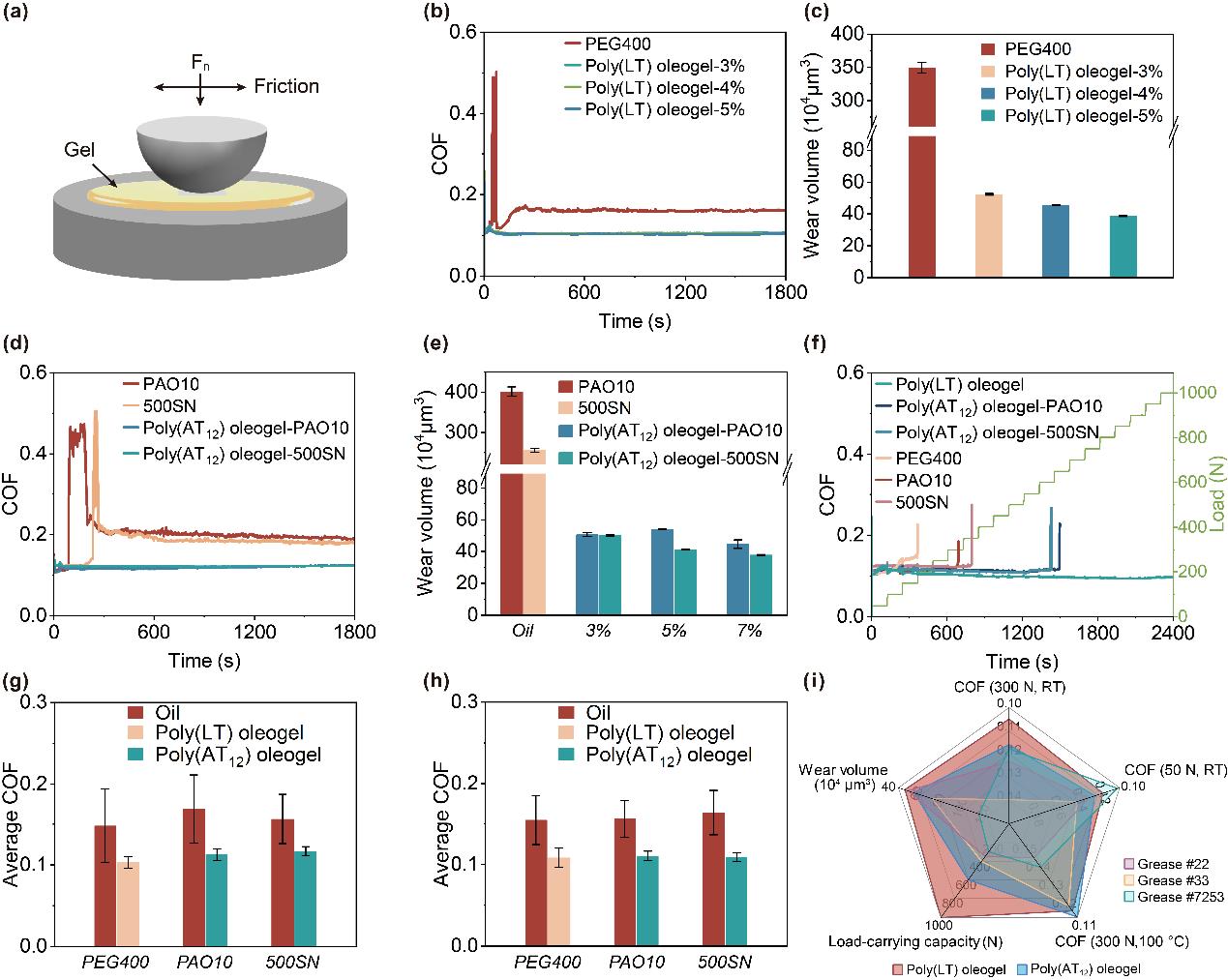 在極端和交變的摩擦條件下,PTA油凝膠表現(xiàn)出優(yōu)異的摩擦學(xué)性能和出色的潤滑穩(wěn)定性,進(jìn)一步證實其對于惡劣、可變工況的適應(yīng)性。通過與商用航空潤滑脂的系統(tǒng)對比,PTA油凝膠具有在多種測試條件下最為均衡的潤滑性能和最優(yōu)異的長期潤滑表現(xiàn)。