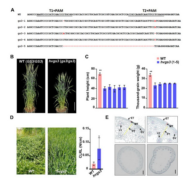 注:A:HvGS3的新型等位變異;B:hvgs3編輯系植株的表型;C:hvgs3編輯系的株高和千粒重;D:hvgs3編輯系的田間抗倒伏表型和倒二節(jié)的抗倒伏指數(shù)(CLRL);E:hvgs3編輯系莖稈的細(xì)胞顯微結(jié)果和細(xì)胞長度。