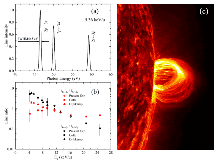 圖:(a-b) 實驗所得N5+與He電荷交換EUV譜線和線強比;(c) 日冕物質(zhì)拋射示意圖