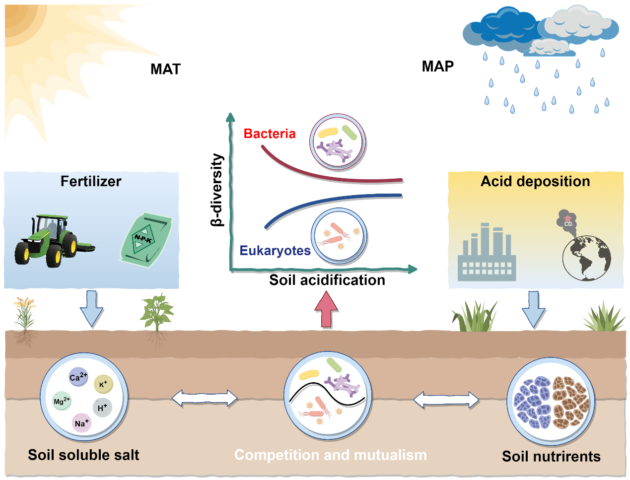 研究進一步發(fā)現(xiàn),隨著土壤酸化程度加深,細菌-真核生物的資源競爭加劇,優(yōu)勢菌群及群落組成發(fā)生重構。鑒于氣候變化及人為因素導致的土壤酸化持續(xù)加劇,可能導致細菌與真核生物進一步解耦,削弱兩者功能協(xié)同性,威脅陸地生態(tài)系統(tǒng)穩(wěn)定性。未來應建立基于土壤pH值動態(tài)的微生物多樣性預警體系,并將跨生態(tài)系統(tǒng)微生物互作機制納入全球變化模型,從而更精準地預測陸地生態(tài)系統(tǒng)的響應。