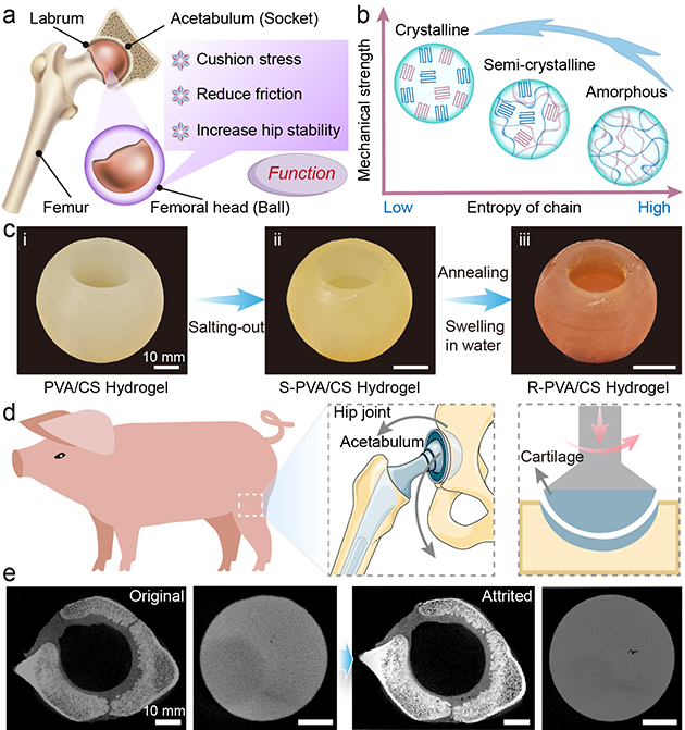 近日,團(tuán)隊(duì)提出了一種低熵納米晶域網(wǎng)絡(luò)調(diào)控策略,即通過調(diào)節(jié)高熵非晶態(tài)和低熵晶態(tài)結(jié)構(gòu)的比例來構(gòu)建機(jī)械魯棒性的潤滑水凝膠。研究人員通過提高聚合物網(wǎng)絡(luò)中PVA大分子鏈的百分比(相對于CS的比例)來誘導(dǎo)PVA鏈的結(jié)晶生長,獲得了具有低熵聚合物鏈態(tài)和高結(jié)晶度的PVA/CS水凝膠,再經(jīng)水化后獲得具有高機(jī)械強(qiáng)度和優(yōu)異潤滑性的水凝膠材料。調(diào)控優(yōu)化的水凝膠斷裂強(qiáng)度為7.7~17.5 MPa、彈性模量為8.6~10.6 MPa、韌性為8.8~62.1 MJ m-3、壓痕硬度為10.4~21.7 MPa,同時(shí)該水凝膠的摩擦系數(shù)可低至0.026,且具有很好的潤滑持久性,實(shí)現(xiàn)了水凝膠在機(jī)械強(qiáng)度和潤滑性能的雙重提升,解決了傳統(tǒng)水凝膠在高負(fù)載條件下易破裂或變形問題。此外,研究還展示了PVA/CS水凝膠在模擬人體承重組織中優(yōu)異的耐磨性,特別是在人工髖關(guān)節(jié)中的應(yīng)用,為高性能人工關(guān)節(jié)潤滑材料的研發(fā)提供了新思路。