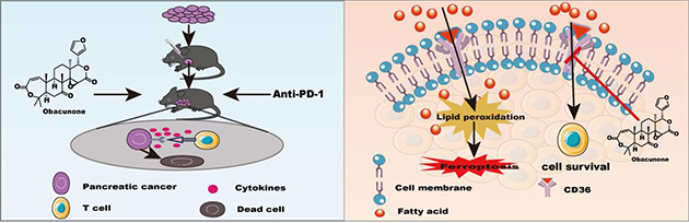 胰腺癌是一種惡性程度極高的消化系統(tǒng)腫瘤,五年生存率不足10%,目前缺乏有效的臨床治療措施,嚴重影響人類生命健康。近期,研究團隊發(fā)現(xiàn)黃柏酮能顯著增強抗PD-1免疫療法治療胰腺癌的效果,增加腫瘤組織中免疫標志物CD4+和CD8+T細胞的浸潤而抑制腫瘤生長,蛋白質(zhì)組學分析發(fā)現(xiàn)黃柏酮主要通過調(diào)控CD36介導的PPAR信號通路,抑制胰腺癌PANC-1細胞CD36表達,增加CD8+ T細胞數(shù)量,促進胰腺癌細胞凋亡,從而抑制胰腺癌細胞生長。相關(guān)研究成果發(fā)表在European Journal of Pharmacology(994 (2025) 177367)上。