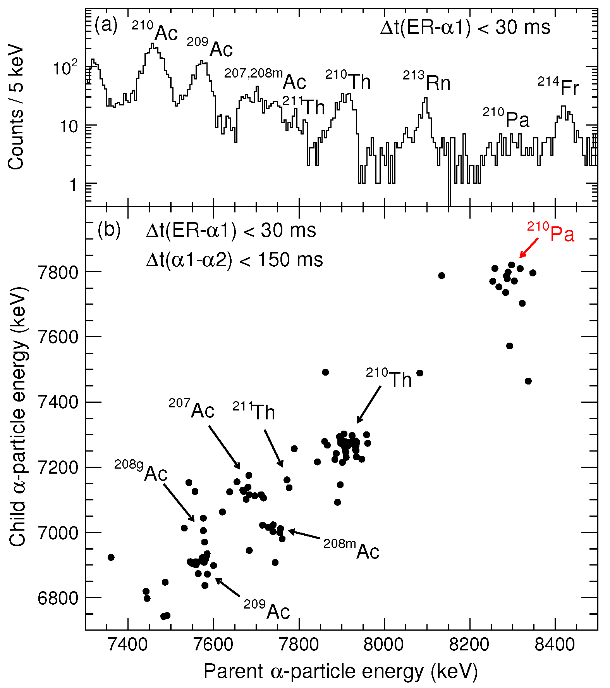 研究團(tuán)隊(duì)利用中國(guó)超重元素研究加速器裝置(CAFE2)提供的鈣-40束流轟擊镥-175靶,通過(guò)熔合蒸發(fā)反應(yīng),在充氣反沖核譜儀(SHANS2)上成功合成了質(zhì)子滴線(xiàn)外新核素鏷-210,并成功測(cè)量了該核素的α衰變能量和半衰期。