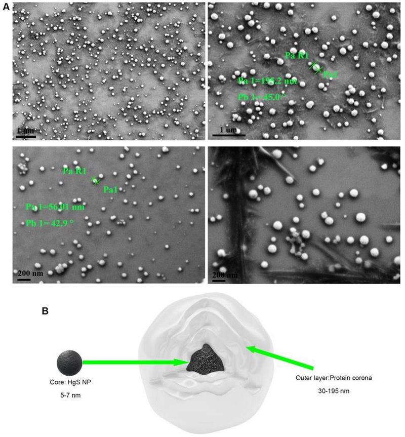 中國科學院西北高原生物研究所高原藥用資源生態(tài)保護與繁育研究團隊通過建立創(chuàng)新性金屬制劑研究體系,首次在細胞、小鼠和人體血液中證實金屬制劑能夠被生物合成為粒徑均一的HgS 納米顆粒。更重要的是通過分離純化手段首次觀察到具有完整蛋白冠的金屬納米顆粒。相對純凈完整結(jié)構(gòu)的呈現(xiàn)不僅直觀證實了蛋白冠的存在,也為蛋白冠中蛋白質(zhì)的分析奠定了基礎(chǔ)。蛋白冠蛋白質(zhì)組成一直以來存在巨大分歧。本研究中通過分析HgS納米顆粒蛋白質(zhì)組成,證實金屬納米顆粒蛋白冠中蛋白質(zhì)類型多樣,初步排除了蛋白冠僅由血清白蛋白組成的相關(guān)報道。