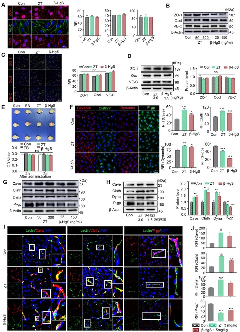通過細胞蛋白組學分析結(jié)合體內(nèi)外蛋白驗證,初步證實金屬制劑主要通過調(diào)節(jié)血腦屏障中的轉(zhuǎn)胞吞作用實現(xiàn)高效的跨腦遞藥功能。它能夠通過上調(diào)腦微血管中caveolin,clathrin,和 dynamin蛋白的表達促進藥物向腦內(nèi)轉(zhuǎn)運,同時顯著降低 P-gp的表達,以減少血腦屏障對藥物的外排作用,從而實現(xiàn)藥物在腦內(nèi)的高效富集。另外,值得關(guān)注的是,HgS金屬制劑并沒有引起血腦屏障緊密連接相關(guān)蛋白的表達降低,說明它對藥物的入腦作用并不是通過血腦屏障結(jié)構(gòu)的暫時性開放而實現(xiàn)的。