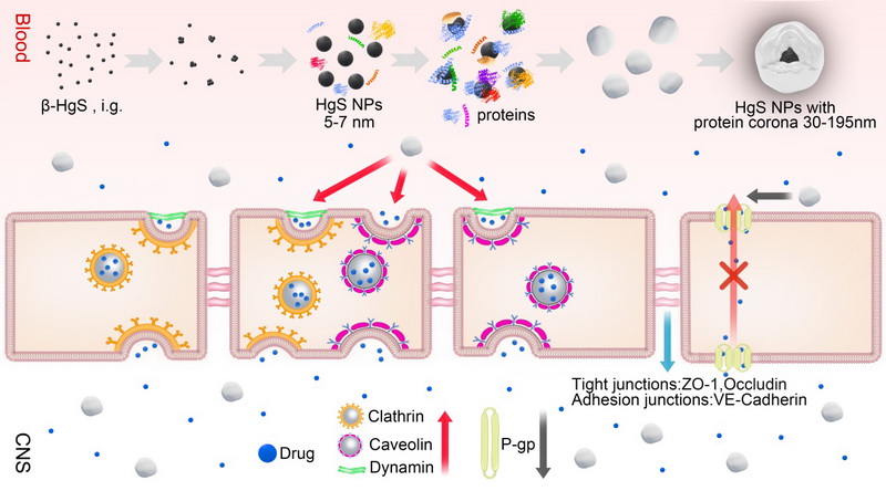 本研究首次揭示了中藏藥核心金屬制劑HgS可以在生物體內(nèi)合成直徑為30-195nm的納米顆粒,并通過調(diào)節(jié)血腦屏障中的內(nèi)吞作用促進不同結(jié)構(gòu)類型的藥物進入大腦,從而實現(xiàn)協(xié)同增效作用。特別值得注意的是,我們不僅在體內(nèi)和體外觀察到了HgS納米顆粒的生物合成,而且還獲得了高等生物合成的HgS納米顆粒的最清晰和完整的形態(tài)特征。金屬制劑在中醫(yī)藥中一直是一種獨特的制劑類型。盡管不斷受到質(zhì)疑,但它們在臨床應(yīng)用中的獨特功效從未被取代。這項研究可能為進一步揭示金屬制劑的協(xié)同機制開辟新思路。