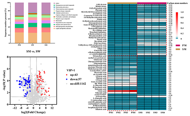 非靶向代謝組學(xué)分析共鑒定出1242種代謝物。在扁蓿豆植株甲醇提取物中,短鏈有機(jī)酸及其衍生物的相對豐度較高;根際土壤水提物中富含生物堿和黃酮類化合物;而根際土壤甲醇提取物則以長鏈有機(jī)酸及其衍生物為主。進(jìn)一步發(fā)現(xiàn),短鏈有機(jī)酸、其衍生物以及黃酮類化合物可能為與扁蓿豆化感作用相關(guān)的關(guān)鍵候選化感物質(zhì)。