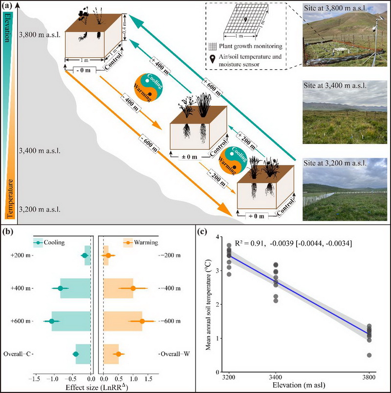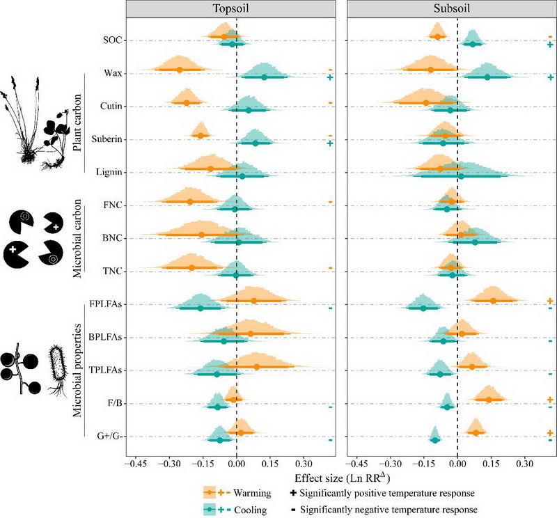 中國科學(xué)院西北高原生物研究所高寒生態(tài)系統(tǒng)與全球變化研究團(tuán)隊(duì)依托2007年在青海海北高寒草地生態(tài)系統(tǒng)國家野外科學(xué)觀測研究站建立的“山體垂直帶雙向移栽實(shí)驗(yàn)”平臺,基于生物標(biāo)志物技術(shù),并借助貝葉斯Meta統(tǒng)計(jì)分析在估計(jì)研究間異質(zhì)性和合并效應(yīng)量方面的優(yōu)勢(尤其在納入研究數(shù)量較少時(shí))、獨(dú)特的后驗(yàn)分布估計(jì)、靈活的參數(shù)設(shè)置和便利的結(jié)果圖形化展示方法等特點(diǎn),創(chuàng)新性地采用貝葉斯Meta分析方法分析控制實(shí)驗(yàn)數(shù)據(jù),對多組處理、對照實(shí)驗(yàn)進(jìn)行了歸納性總結(jié),進(jìn)而系統(tǒng)評估量化了增溫、降溫16年后高寒草甸表層(0-10 cm)和亞表層土壤(20-30 cm)有機(jī)碳含量的影響因素(包括植物生物量和多樣性、土壤理化性質(zhì)、植物源碳組分,微生物源碳組分以及微生物群落特性等)的變化及其與有機(jī)碳含量的關(guān)系。