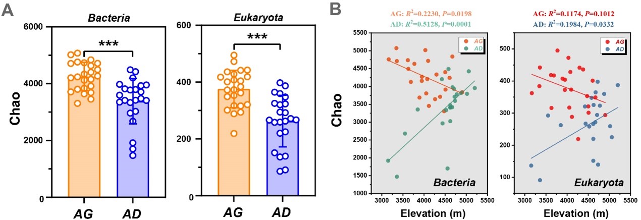 研究發(fā)現(xiàn),兩類生態(tài)系統(tǒng)中,細菌和真核生物α-多樣性呈現(xiàn)相反的海拔格局。高寒草地隨海拔升高顯著線性下降,而高寒荒漠則顯著線性上升。
