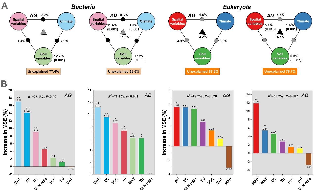 高寒草地與高寒荒漠細菌和真核生物群落組成的地理距離、氣候因子和土壤變量及其相互作用的變異分配分析